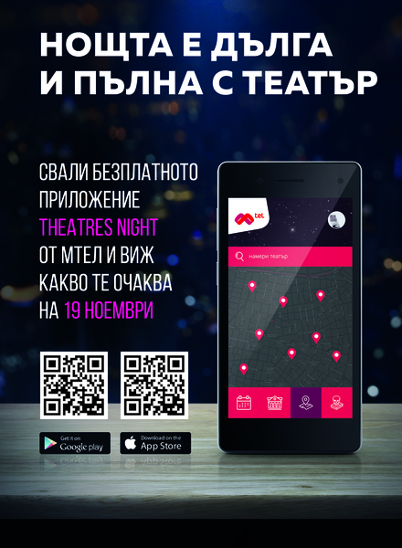 Нощта е дълга е пълна с театър е посланието на мобилния апликейшън на Нощ на театрите, който безплатно може да се свали от Google Play и AppStore и в който е събрано всичко, което ще се случва в Нощта на театрите тази година. Приложението е разработено от Мтел и е подарък за всички почитатели на театралното изкуство.