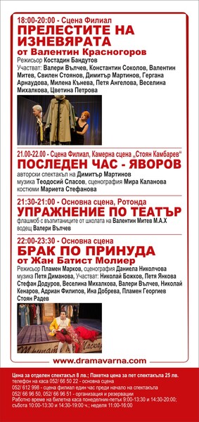 След подобно силно преживяване разведряващо ще подейства флашмобът „Упражнение по театър” с възпитаниците от школата на Валентин Митев „М.А.Х.” Те не само ще демонстрират как актьорите „загряват” за спектакъл, какви техники за концентрация и дишане използват, как влизат в образ, а и обещават да вкарат най-смелите от публиката в упражненията. С други думи, не пропускайте това прелюбопитно занимание от 21.30, Сцена Ротонда, след което Европейската нощ на театрите ще завърши с „Брак по принуда”. В постановката на Пламен Марков по фарсове на Молиер, със сценография отново на Даниела Николчова и музика отново на Петя Диманова участват всеотдайно: Николай Божков, Петя Ангелова, Стефан Додуров, Веселина Михалкова, Валери Вълчев, Николай Кенаров, Адриан Филипов, Ина Добрева, Пламен Георгиев, Стоян Радев. С общите им усилия „Бракът по принуда”, който ще започне в 22.00, ще бъде „разтрогнат” в 23.30.